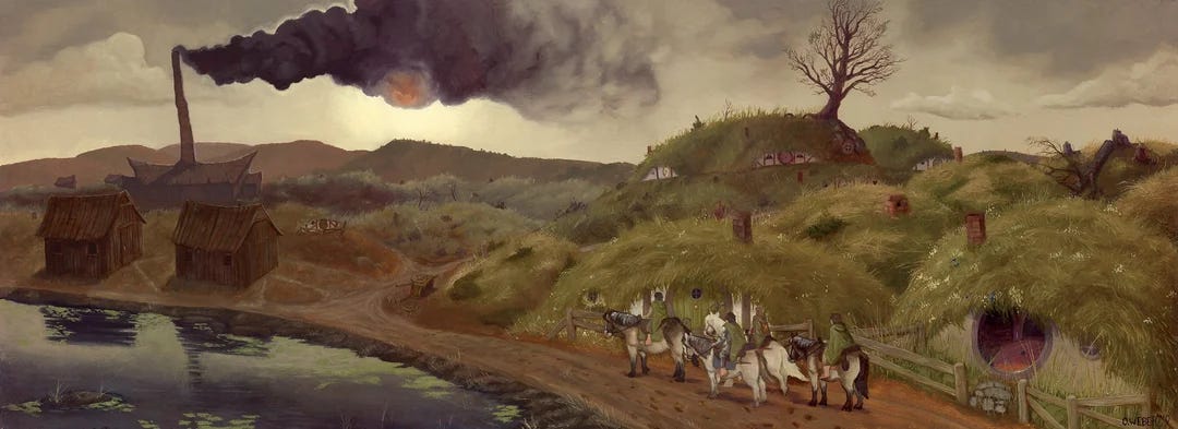 “The pleasant row of old hobbit-holes in the bank on the north side of the Pool were deserted … Worse, there was a whole line of ugly new houses all along Pool Side where the Hobbiton Road ran close to the bank. An avenue of trees had stood there. They were all gone. … And looking with dismay up the road towards Bag End they saw a tall chimney of brick in the distance. It was pouring out black smoke into the evening air.” - The Return of the King, Bk. VI, Ch. viii